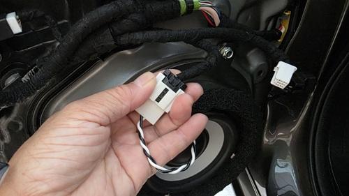 音質向上目的のドアウーハー交換とプロセッサー内蔵アンプ追加取り付けを実施中の、マツダアテンザ(GJ型後期)BOSE付車ドアウーハー接続