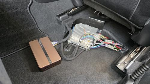 運転席下にある純正BOSE製アンプへ、音質向上するDSPアンプを追加接続します。