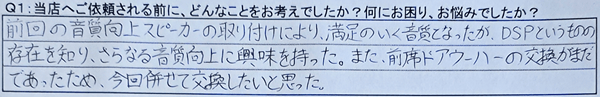 A1:前回の音質向上スピーカーの取り付けにより、満足のいく音質となったが、DSPというものの存在を知り、さらなる音質向上に興味を持った。また、前席ドアウーハーの交換がまだであったため、今回併せて交換したいと思った。