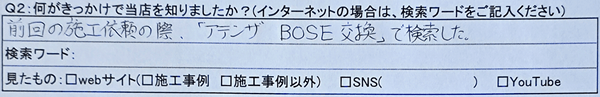 A2:前回の施工依頼の際、「アテンザBOSE 交換」で検索した。