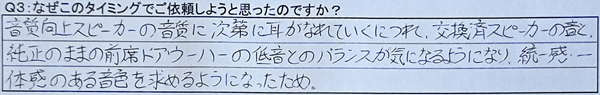 A3:音質向上スピーカーの音質に次第になれていくにつれ、交換済スピーカーの音と、純正のままの前席ドアウーハーの低音とのバランスが気になるようになり、統一感・一体感のある音色を求めるようになったため。