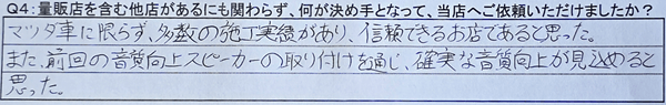 A4:マツダ車に限らず、多数の施工実績があり、信頼できるお店であると思った。また、前回の音質向上スピーカーの取り付けを通じ、確実な音質向上が見込めると思った。