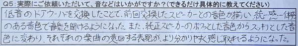 ドアウーハー交換によって、ボワンとしていた低音が、締まりのあるビシッとした低音に変わります。