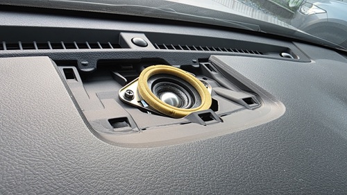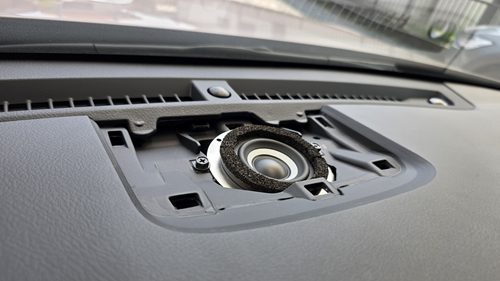 Aピラー内装とダッシュボード上グリルを取り外すと、ダッシュボード上スピーカーの姿が見えます。