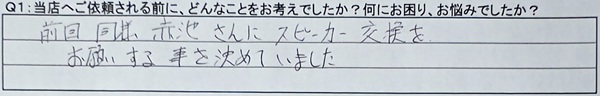 A1:前回同様、赤池さんにスピーカー交換をお願いする事を決めていました。