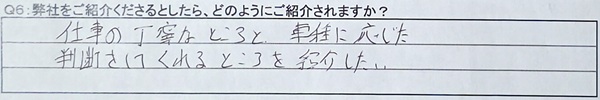 A6:仕事の丁寧なところと、車種に応じた判断をしてくれるところを紹介したい。