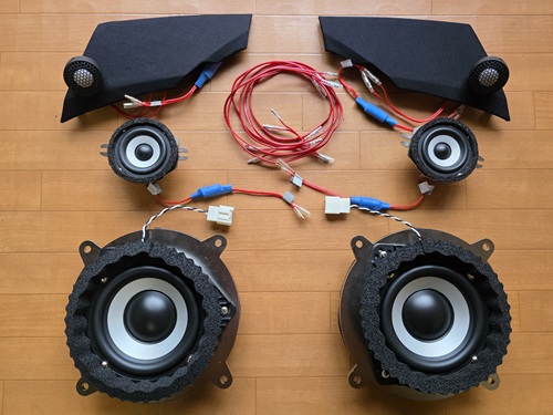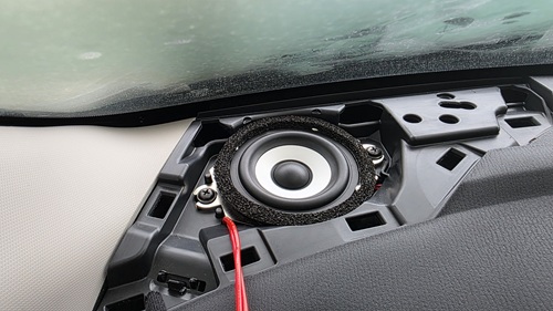 ダッシュボード上純正スピーカー位置には中音用スピーカー(スコーカー)を追加し、グリル上に高音用スピーカー(ツィーター)を追加することで、高音から低音まで、満遍なく音が出る状態にします。