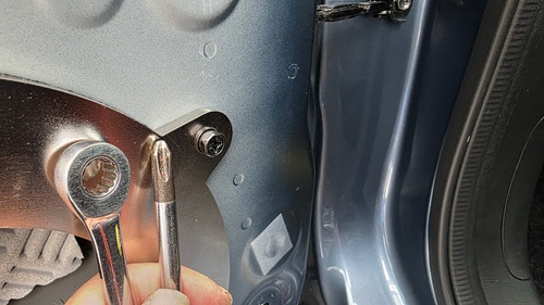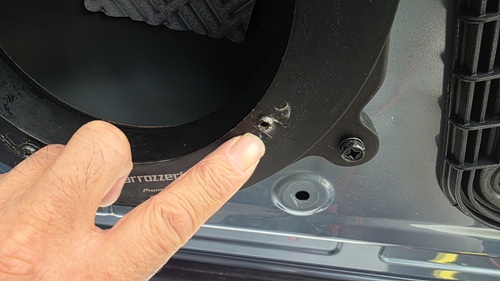 オーディオ音質向上目的のスピーカー交換を実施前の、マツダCX-5(KE型)標準オーディオ付車ドアスピーカー固定台座のネジ穴