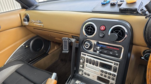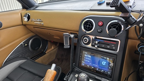 ボディソニックやヘッドレストスピーカー、ツィーター等の純正機材を流用し、市販ディスプレイオーディオを取り付け後の、ユーノスロードスター(NA型)センソリーサウンドシステム付車オーディオ全景