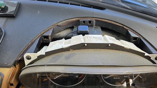 ボディソニックやヘッドレストスピーカー、ツィーター等の純正機材を流用し、市販ディスプレイオーディオを取り付け中の、ユーノスロードスター(NA型)センソリーサウンドシステム付車メーターフード取り外し後