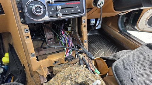 ボディソニックやヘッドレストスピーカー、ツィーター等の純正機材を流用し、市販ディスプレイオーディオを取り付け中の、ユーノスロードスター(NA型)センソリーサウンドシステム付車オーディオ部分