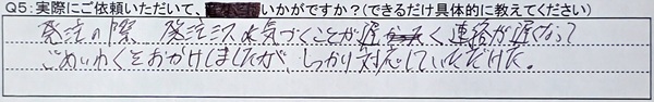A5:発注の際、発注ミスに気付くことが遅く、連絡が遅くなってごめいわくをおかけしましたが、しっかり対応していただけた。