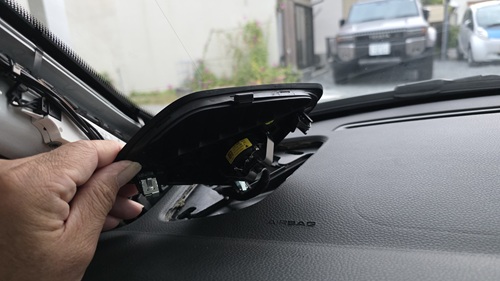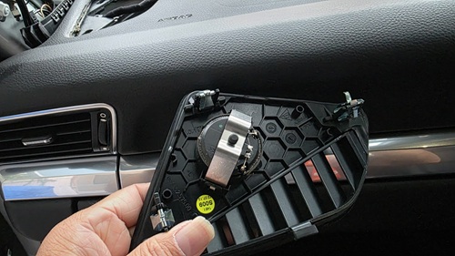 音質向上ツィーターを装着したグリルをダッシュボードへ取り付けすると、ツィーター交換が完了します。
