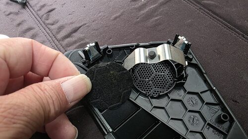 ダッシュボード上ツィーターが装着されていたグリル背面には、不織布のようなものが貼り付けされています。