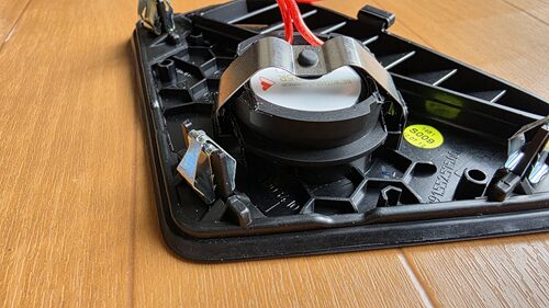 不織布を取り外したダッシュボード上ツィーターグリルへ、音質向上ツィーターを取り付けします。