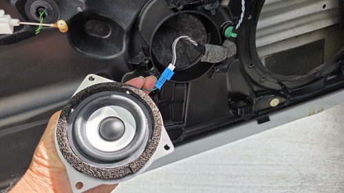 ドア内装を取り外すと、純正ドアスピーカーの姿が見えます。