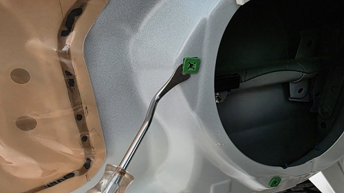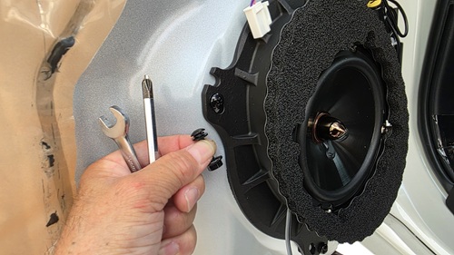純正スピーカーを固定していた樹脂ナットを取り外します。