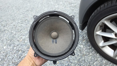純正ドアスピーカーを取り外し、状態を確認しましたところ、振動板周辺のエッジ部分が破損、というより全周欠損していました。