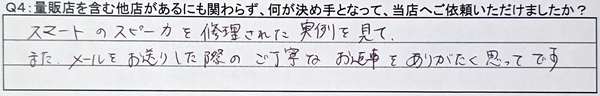 Q4:量販店を含む他店があるにも関わらず、何が決め手となって、当店へご依頼いただけましたか?
