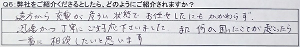A6:遠方から充電が危うい状態でお任せしたにもかかわらず、迅速かつ丁寧にご対応下さいました。また何か困ったことが起こったら一番に相談したいと思います。