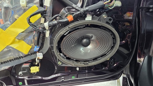 ドア内装を取り外すと、純正スピーカーの姿が見えます。