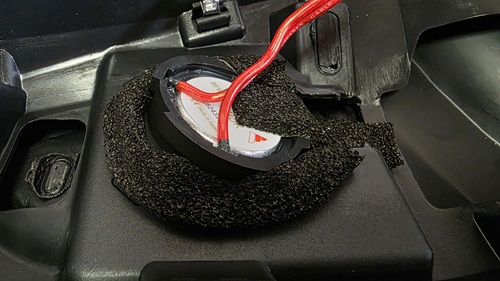 スピーカーとドア内装の間に発生する隙間は、空気を通さないスポンジ材で塞ぐことで、不快なドア内装の鳴きやビビリ音を防止します。