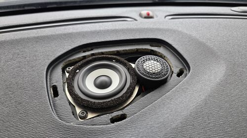 ツィーターも純正位置への装着ですが、運転席や助手席に高音が届きやすくなるよう、角度付け固定を実施しております。