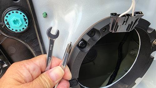 ドア内装を取り外すと、純正ドアスピーカーの姿が見えます。